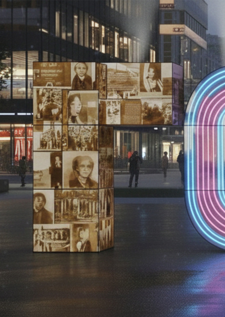 Инсталляция — это набор крупных, стилизованных «кубиков», из которых складывается слово «ГОРОД». Каждый куб посвящен теме издания и имеет свою текстуру и интерактив: здесь можно коснуться истории на потрёпанных фото, ощутить технологии через световые волны, увидеть себя в зеркале настоящего, почувствовать вкус улиц и оставить свой след на грифельной стене Г — «ИСТОРИИ»: облицован коллажем из архивных фотографий Москвы и Петербурга О — «технологии»: световые волны Р — «люди»: зеркальные поверхности О — «еда»: фотографии еды, любимых блюд жителей городов Д — «арт»: магнитно-грифельная краска, где каждый сможет оставить частичку себя и нарисовать что-то