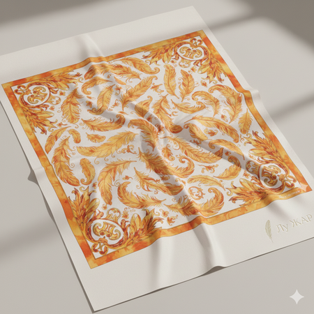размером 130×130 см, 150 dpi     платок с рисунком орнамент жар птица сказка в акварели В оранжевых цвета на белом фоне по сюжету сказки