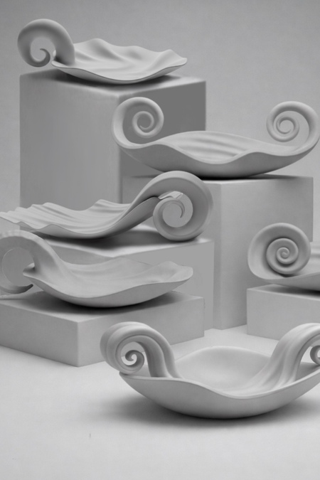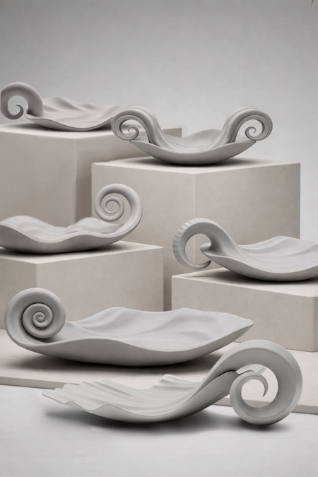 Коллекция вдохновлена природными процессами, в которых форма никогда не обрывается, а перетекает сама в себя: морские раковины, рога, рост растений, вихри воды и воздуха. Каждая тарелка словно находится в моменте становления — она заворачивается, тянется, изгибается, создавая ощущение движения даже в покое.