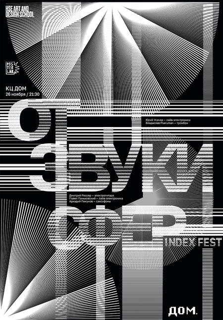 С 26 по 30 ноября в КЦ ДОМ прошёл фестиваль INDEX-FEST, объединивший множество артистов с самобытными звучаниями. По результатам жеребьёвки мне досталась ключевая метафора «электроакустический нойз» и концерт «Отзвуки сфер», что помогло сформировать «характер» моего плаката.