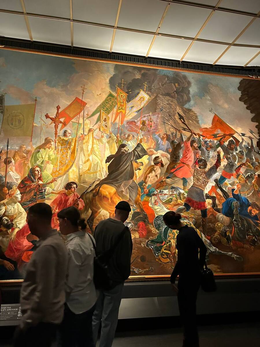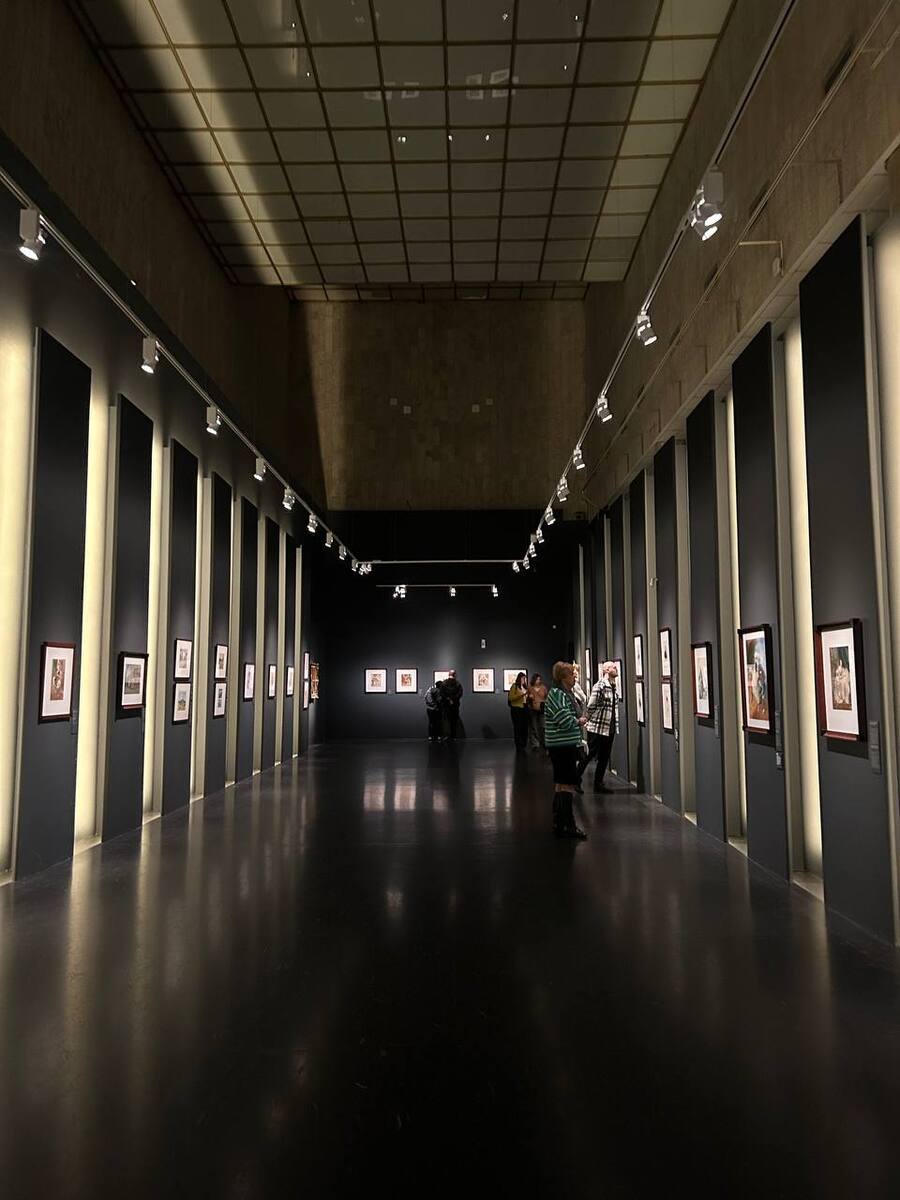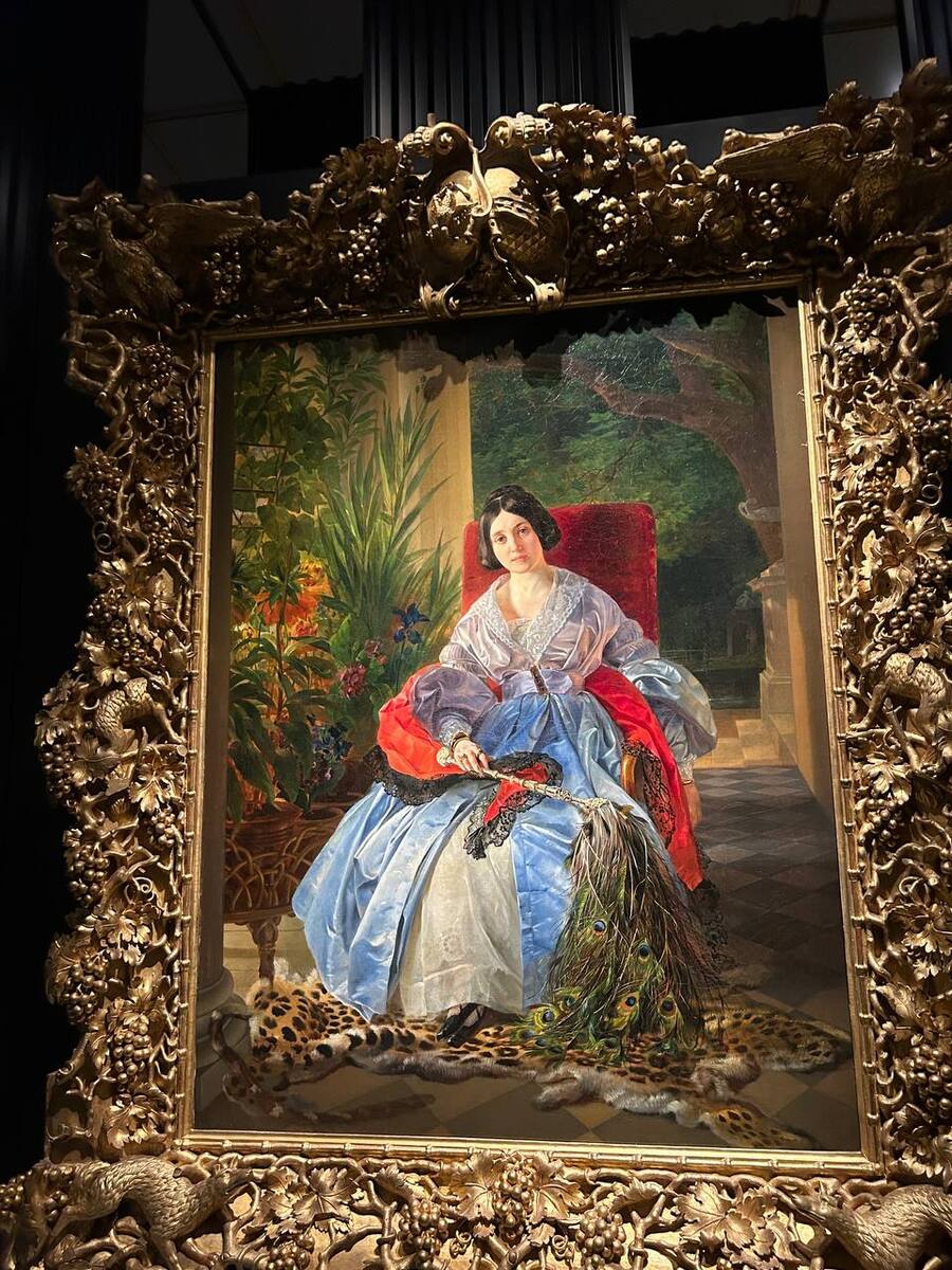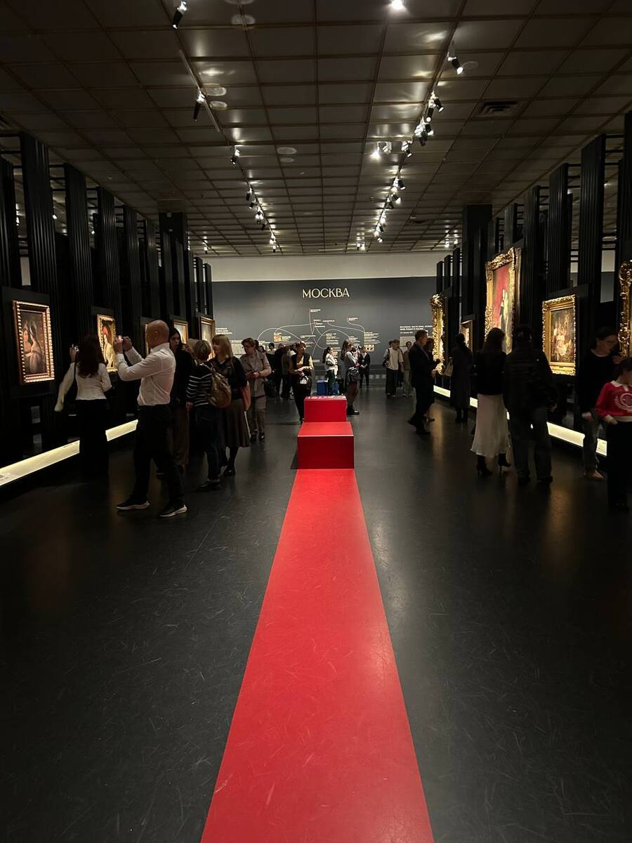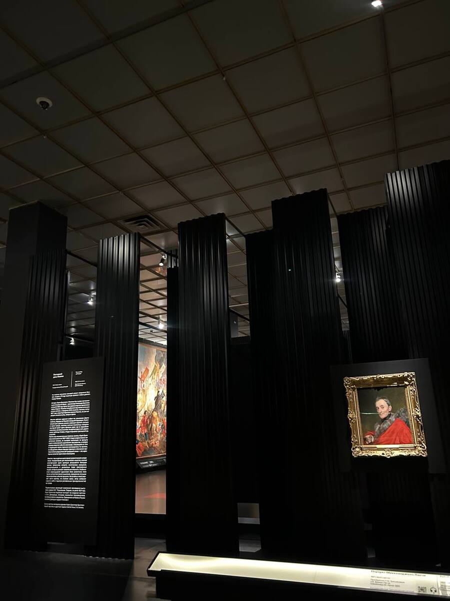 Экспозиция была выстроена продуманно: пространство не мешало восприятию работ, а наоборот помогало им звучать ярче. Картины были аккуратно подсвечены, свет подчеркивал объем и детали, не создавая бликов. Черный фон оставался нейтральным и не перетягивал внимание, благодаря чему рамки и сами полотна смотрелись выразительнее. Навигация по залу была интуитивной, маршрут складывался естественно. У каждой работы стояли понятные подписи, так что вглядеться и понять контекст можно было сразу.