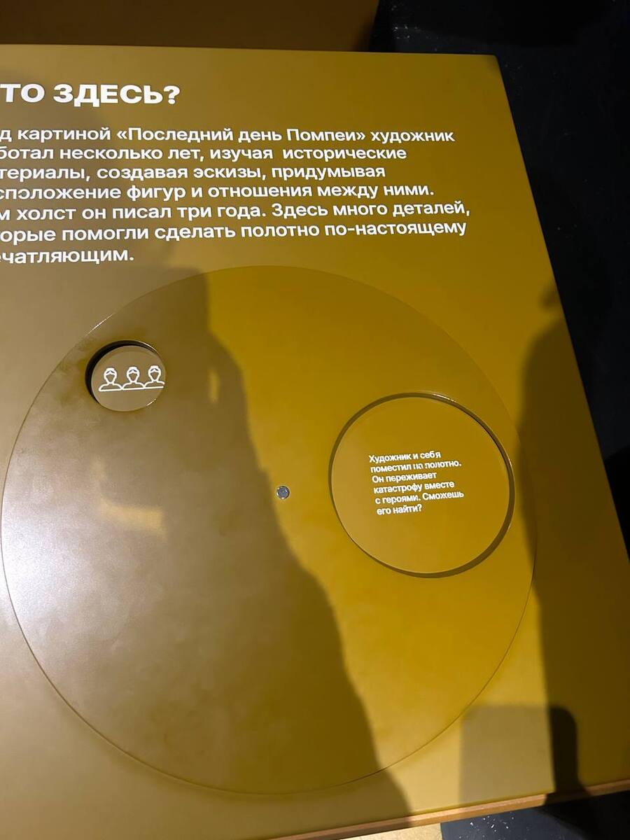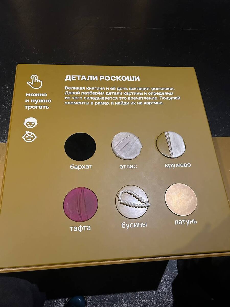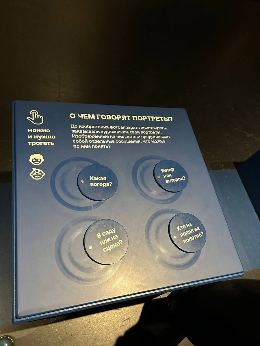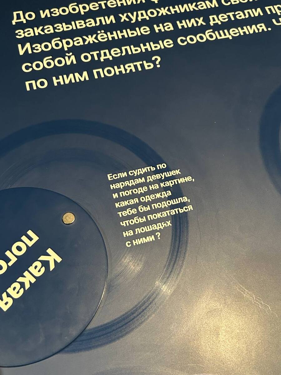 На площадке стояли интерактивные кубы с вопросами и дополнительной информацией к картинам. Формат был рассчитан в том числе на детей: вопросы побуждали рассмотреть детали, подумать о сюжете и вовлечься в процесс. Эти вставки не выбивались из общей эстетики и добавляли выставке живости, превращая обычный осмотр в небольшое исследование.