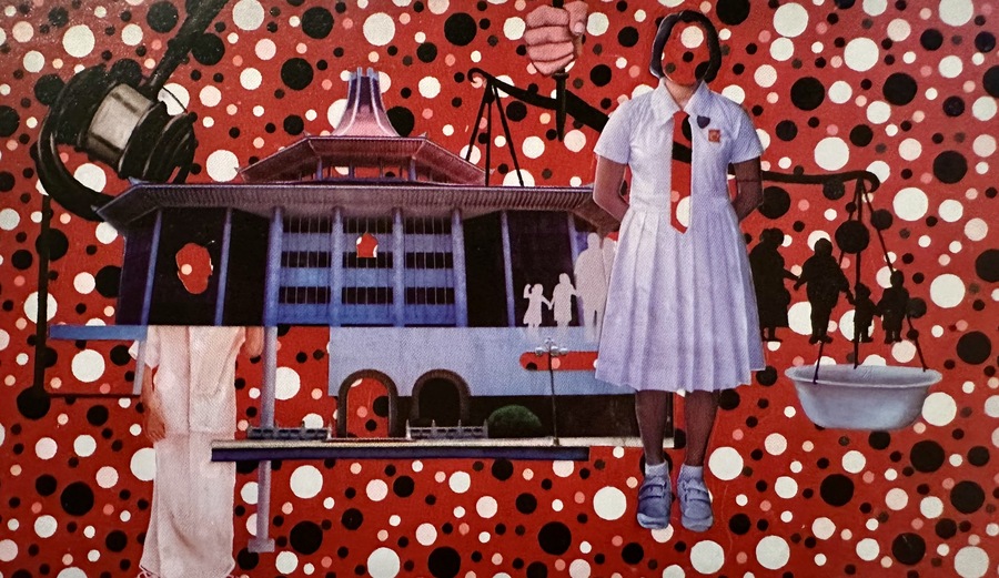На полотне Марко Манампери изображен антиутопический образ мира, где одинокий человек, застрявший в системе коррупции, становится символом надежды на перемены. Цифровая буря отражает тревогу общества, а хаотичные фразы — голоса подавленных людей. Работа отсылает к протестам в Шри-Ланке в 2022 году и говорит о борьбе обычного человека за справедливость и достоинство.
