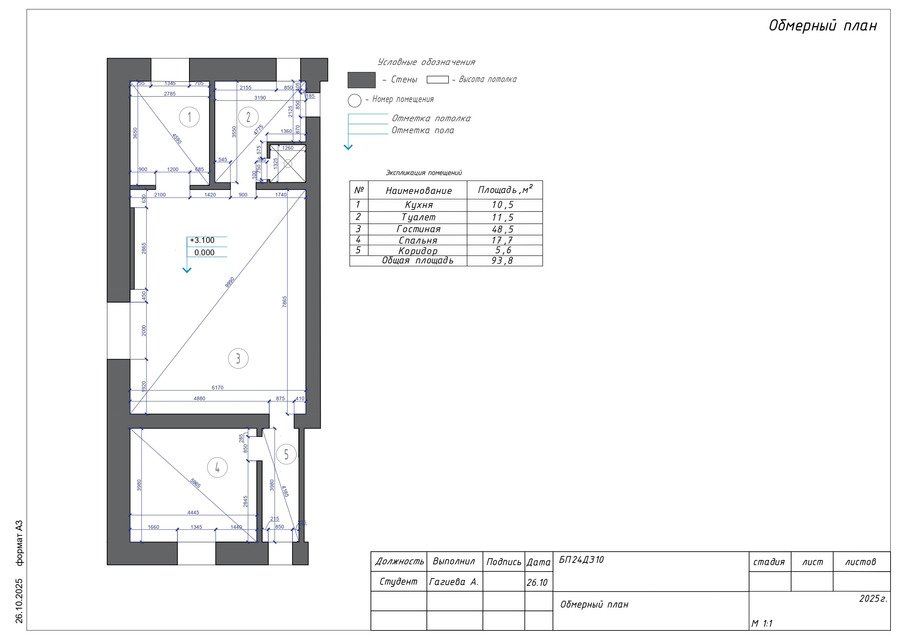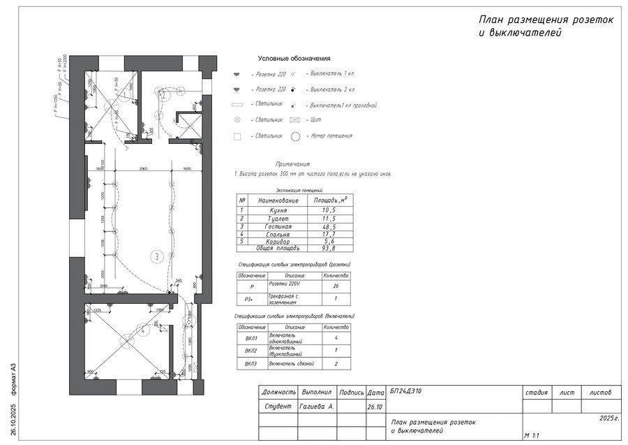 Обмерная практика: Обмерный план и спецификация дверных и оконных проёмов квартиры. План размещения розеток и выключателей и спецификация электроприборов. г. Пермь