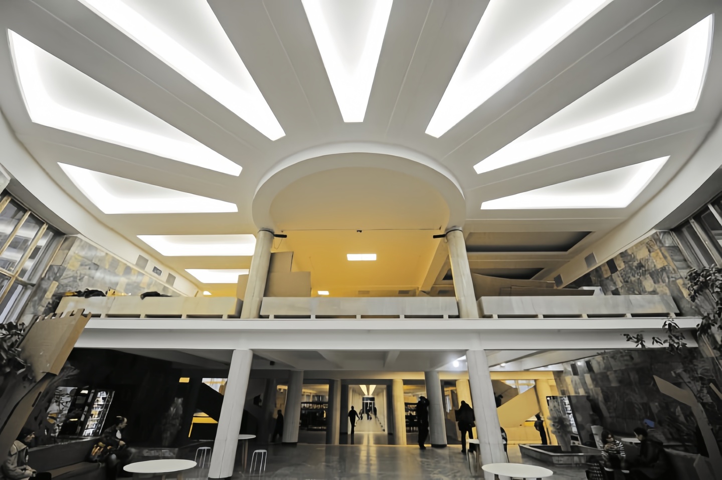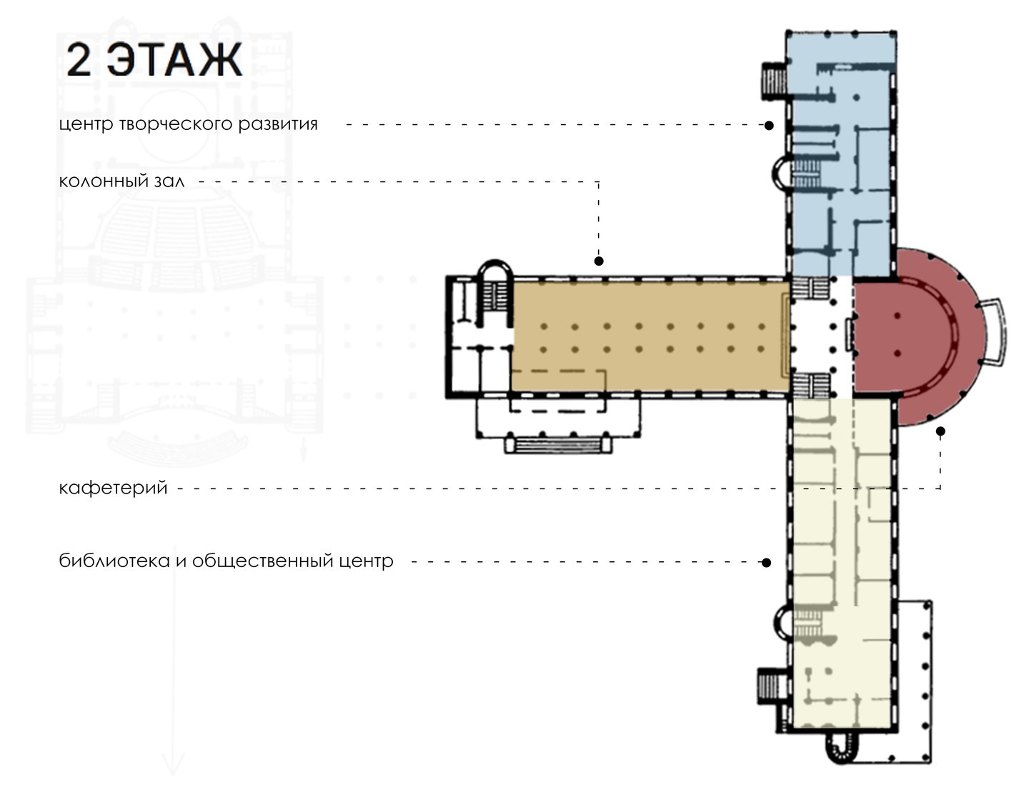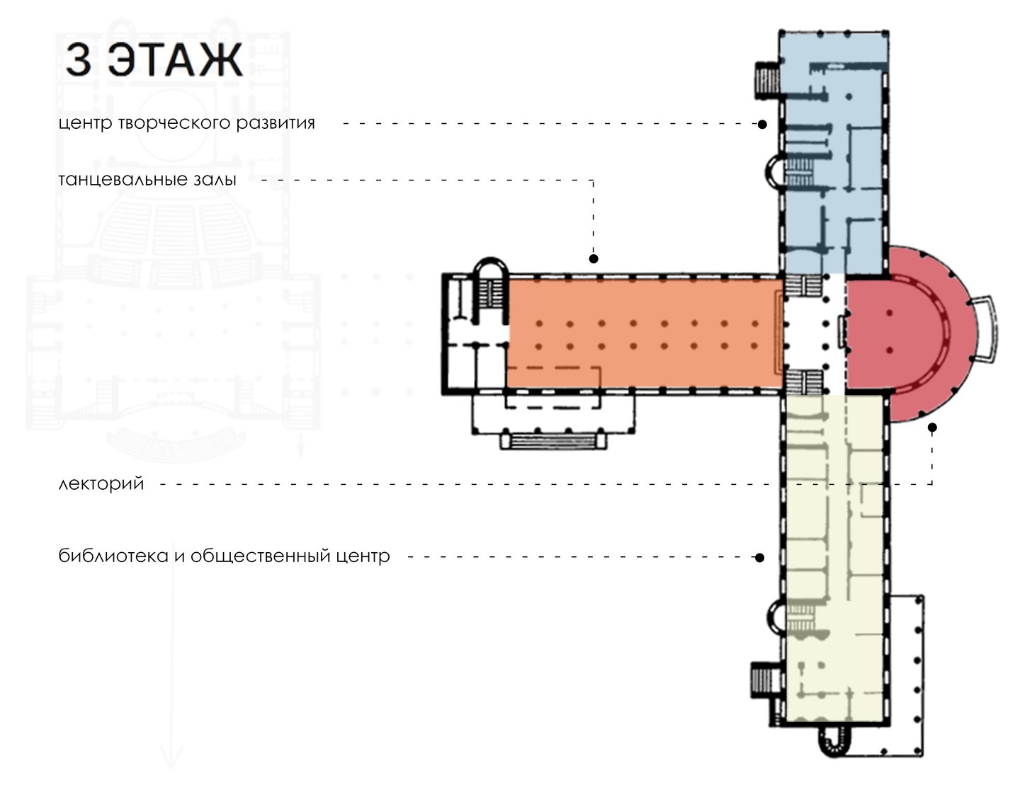 — малый зрительный зал — кинозал — лекторий — большая библиотека с читальным залом — помещения для кружковых секций — хореографические классы — «зимний сад» (зона отдыха) — обсерватория — холл и фойе