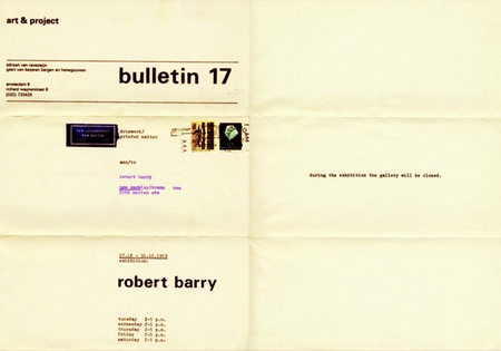 В другом случае художник Роберт Барри написал в 17 номере журнала «Bulletin» фразу «на время выставки галерея будет закрыта». Через год, в 1970 году, он действительно реализовал этот проект в галерее Юджинии Батлер в Лос-Анджелесе. Три недели галерея была закрыта для посещения, а на входе висело то самое объявление Барри.