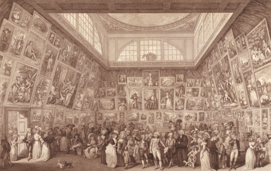 Задача этой подборки — показать то, насколько трудно (точнее, невозможно) было избежать шпалерной развески. В какой бы стране ни оказался бы человек, живущий на рубеже XIX–XX веков, он увидел один и тот же способ организации восприятия произведений искусства. Это было связано в первую очередь с характером самого искусства: до середины XIX века в живописи была распространена замкнутая композиция с единой точка схода и глубокой проработкой планов и перспективы. Взгляд зрителя немедленно проваливался в работу, которая к тому же, как правило, была обрамлена в широкую раму, и не отвлекался ни на что.
