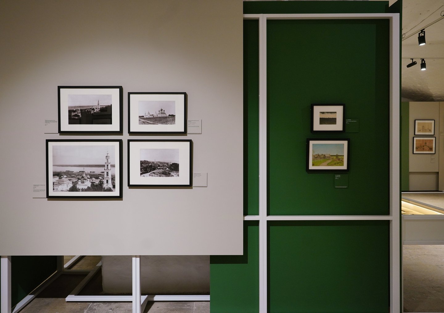 Разделы экспозиции следуют друг за другом, мягко перетекая один в другой. Точка старта — «Город Юрьевец». Он погружает посетителей выставки в небольшой город на Волге. Именно здесь, в уездной насыщенной архитектурной среде зарождалось будущее видение. Визуальный ландшафт детства братьев — архивные снимки одноэтажной деревянной застройки, величественных, но утраченных впоследствии соборов, схематических планов казенных учреждений. Особое место занимает старейшая Благовещенская церковь фрагменты ее изразцов, спрятанные в витринах, и, что особенно ценно, обмерные планы, выполненные юным Леонидом. Эти чертежи — первый шаг от созерцания к анализу формы. На выставленных документальных фотографиях город — живой организм с присущей ему религиозностью (фотографии обрядов) и сложившимся бытовым укладом, который Веснины впитали и позже стремились трансформировать.