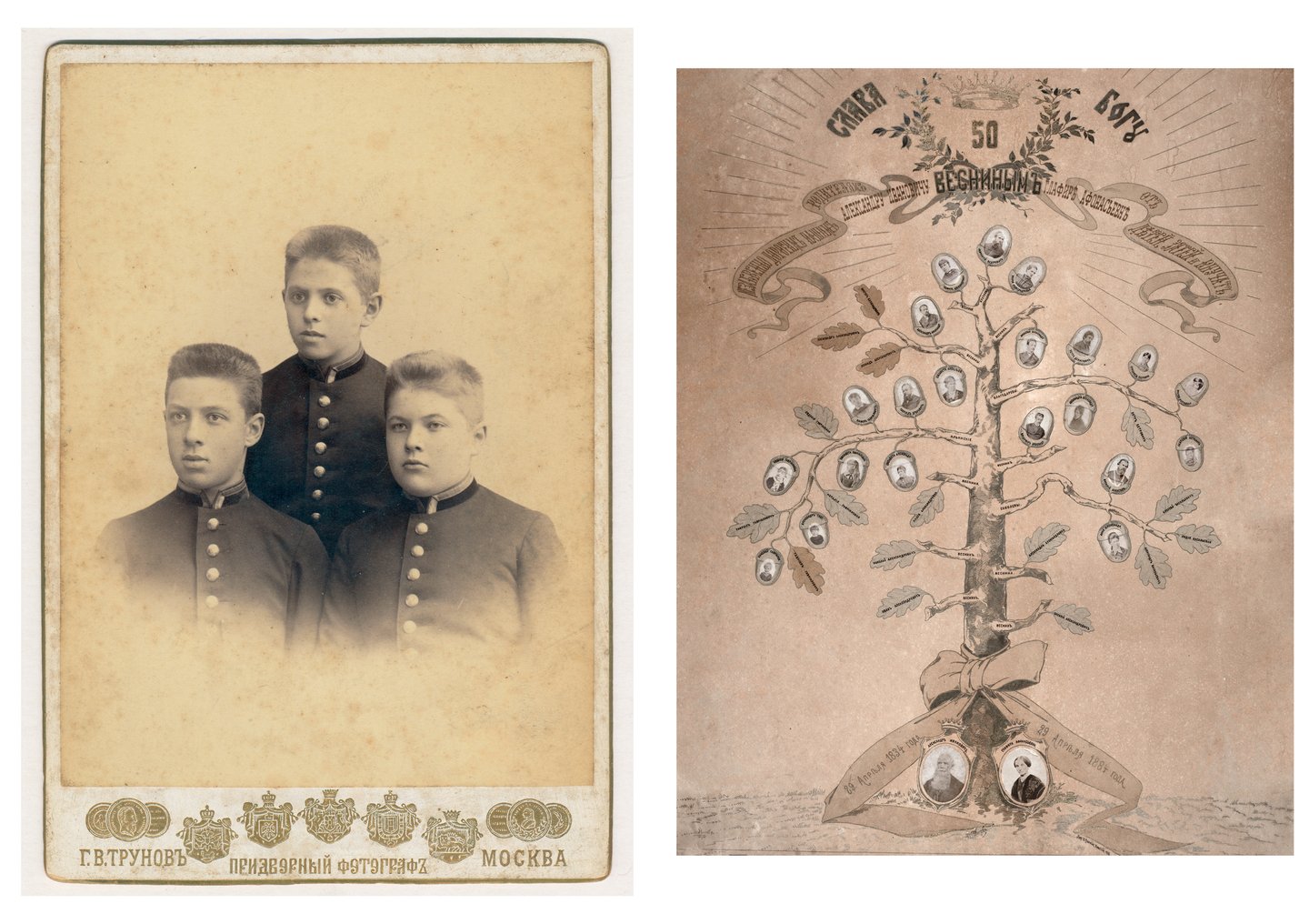 Изобр. 1: На фоне справа — икона Николая Чудотворца со святыми-покровителями семьи Весниных / Изобр. 2: Групповой портрет братьев Веснины и генеалогическое древо