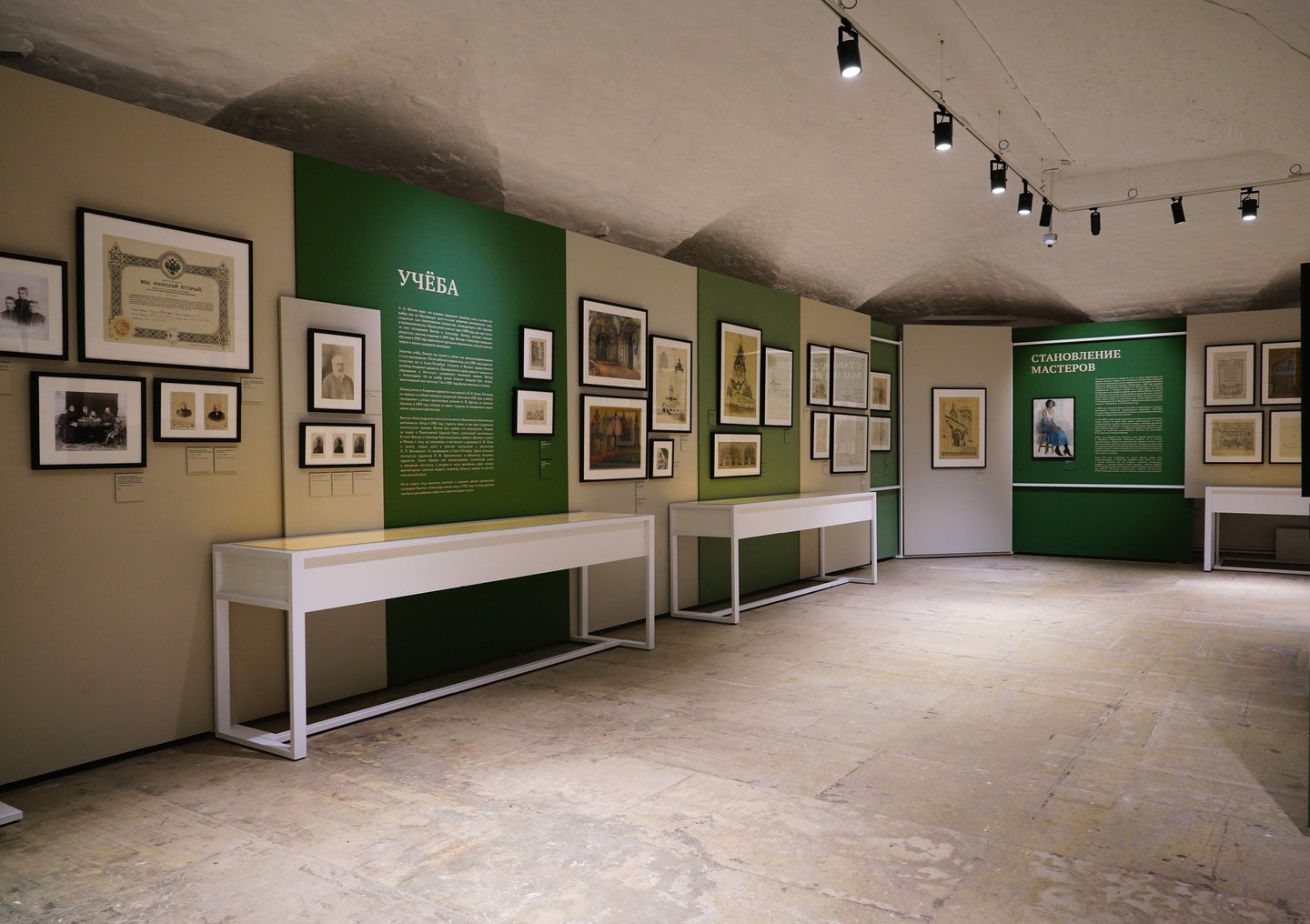 Раздел «Учеба» прослеживает осознанный путь к профессии: Московская практическая академия коммерческих наук дала деловую хватку, а высшее художественное (Леонид Веснин, учившийся у Бенуа и Щусева) и инженерное (Виктор и Александр Веснины) образование сформировало тот уникальный синтез искусства и техники, который стал их визитной карточкой. Учебные работы — копии полотен знаменитых живописцев, проект курзала Леонида, церковные проекты Александра и Виктора — демонстрируют освоение «стилей» и поиск своего языка.