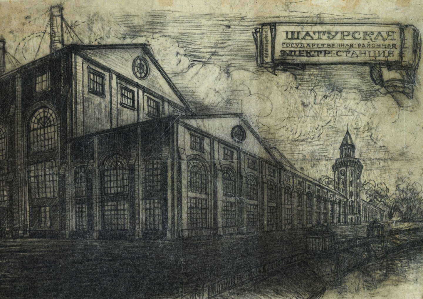 1: Л. А. Веснин. Проект Шатурской ГРЭС, 1919. Калька, уголь / 2: В. А. Веснин Здание Ивановского с/х банка и универмага в городе Иваново-Вознесенск, 1927. Бумага, тушь