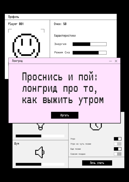 Интерактивный лонгрид о том, как облегчить процесс пробуждения и превратить его в триумфальное начало дня, оформленный как игра. Проходите уровни, открывайте новые советы, повышайте скиллы и выполняйте миссии, чтобы стать Повелителем утра!