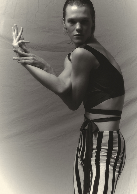 Костюм ландскнехта очень привлекал внимание, изначально он был обтягивающим, хоть это и подчеркивало красоту мужского тела, но в нем было очень неудобно, потому что ткани того времени почти не были эластичными. Зачастую форма сковывала движение, из-за чего воинам приходилось делать разрезы. Художники часто идеализировали образы. В гравюрах Дюрера складывается ощущение, что дублет пытается придать телу идеальную форму. Я использовала в своей коллекции эффект стягивания и облегания, чтобы создать современный мужественный, но при этом легкий и провокационный образ, подчеркивающий мужские достоинства. Основным ярким и узнаваемым элементом является — полоска. Во времена Максимилиана - церковь запрещала оголять тело, поэтому форма была полностью закрытой. Так как сейчас это является не актуальным, решила сделать открытыми грудь, плечи, живот. Я старалась сохранить силуэт костюма и сложность формы с помощью наслоения, также метод стачивания ткани в полоски, и использовала затяжку шнурком для создания фактуры.