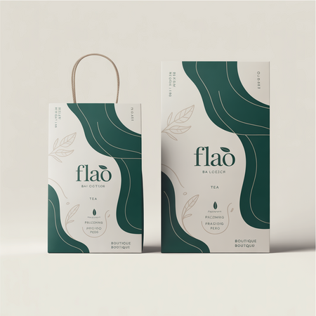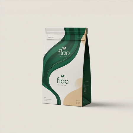 Minimalist promotional packaging design for FLAO tea brand, clean white base with deep jade green flowing line accent, subtle tea leaf watermark, modern sans-serif logo «FLAO», balanced asymmetrical layout, luxury boutique feel, soft cream accent colors, zen-inspired calm aesthetic, suitable for retail bags, brochures, and stickers, premium print quality mockup with natural lighting