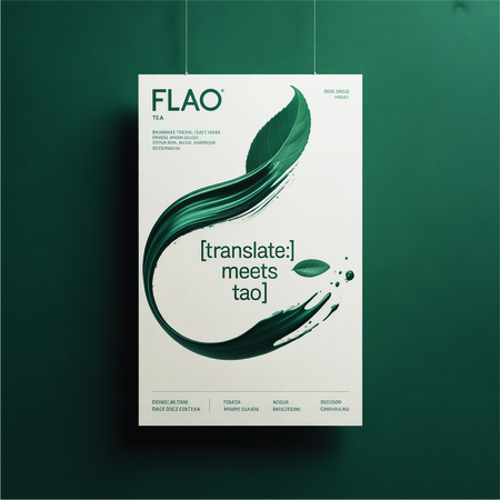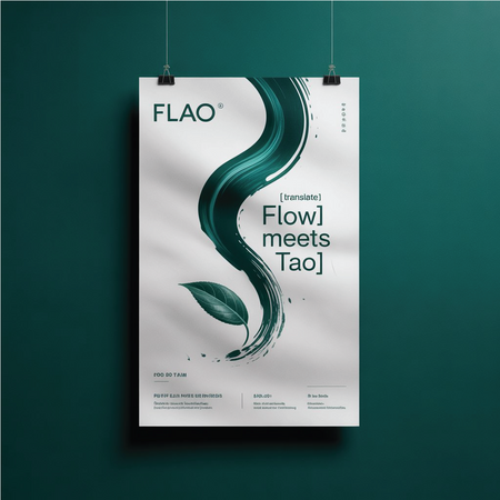 Minimalist A4 advertising poster for FLAO tea brand, predominantly white background with deep jade accents, philosophical concept «[translate: Flow meets Tao]» subtly integrated, single flowing brushstroke as main visual element, typography: clean sans-serif FLAO wordmark with minimal supporting text, subtle tea leaf silhouette integrated into design composition, luxury aesthetic with zen-like calmness, balanced asymmetrical layout, sophisticated color palette, suitable for gallery or boutique display, premium print design, professional studio lighting in mockup