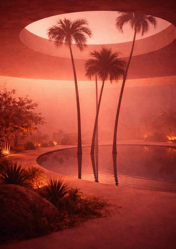 Сад «Eco» — пространство тишины и смещённого восприятия. Отражения, тени и паузы между эпизодами заменяют прямые виды. Простая локальная растительность и сдержанный свет формируют не маршрут, а опыт медленного присутствия и внутреннего покоя.