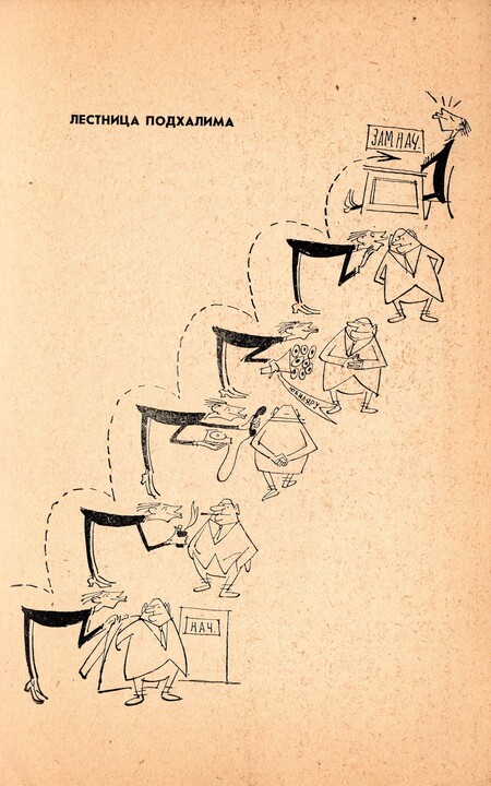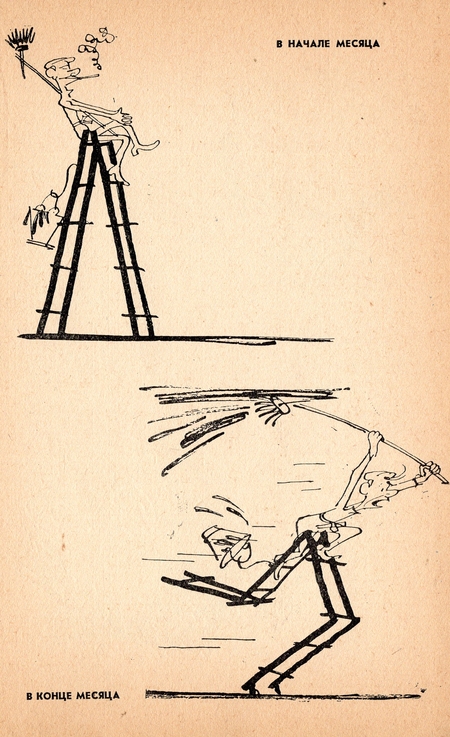 Все изображения в статье взяты из книги-сборника карикатур Черепанова «На веселой орбите» издательства «Московский Рабочий» 1963 года — массового издательства, печатавшего популярную литературу. Обратим внимание на то, как художник вписывает стрип в вертикальный книжный формат (справа) — риторические панели, неслучайная форма и расположение которых также участвует в нарративе, сообщает нам нечто о происходящем.