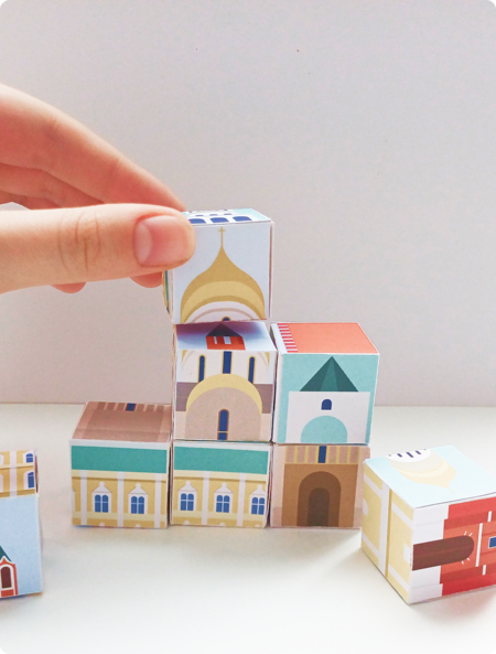 Игрушка — набор магнитных кубиков с изображениями ансамбля Московского Кремля. На каждой грани — одно здание. Ребенок может собирать как конкретные объекты, дополнительно изучая информацию о них в мини-книжке и раскрасив раскраску, так и проявлять фантазию, собирая что-то свое из разных кубиков.