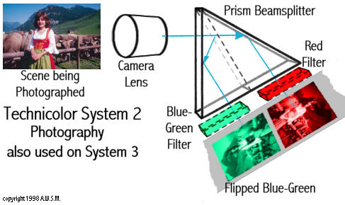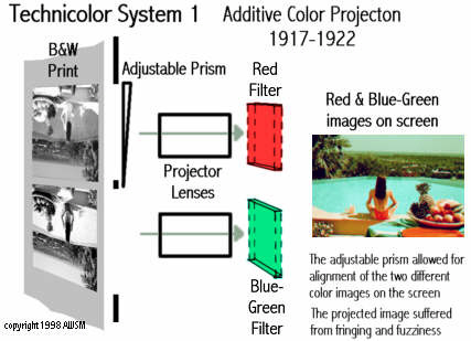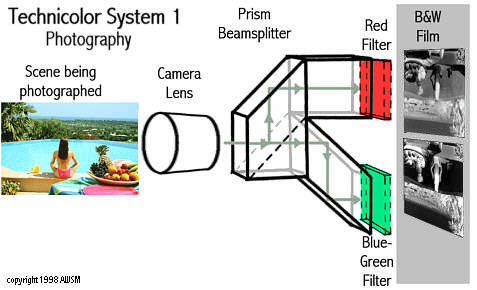 Корпорация Technicolor была основана в 1915-м году. Объединенные команды инженеров из трёх компаний представили публике особую призму разделявшую лучи света на два видимых цветовых спектра: зелёный и красный. Данная призма устанавливалась между объективом и фотокарточкой. В 1917-м году Technicolor разработала призму уже для проекторов, но всё ещё в двух спектрах, поэтому производимые ими призмы считаются первой технологией или же двух-потоковой технологией Technicolor (1917-1922)