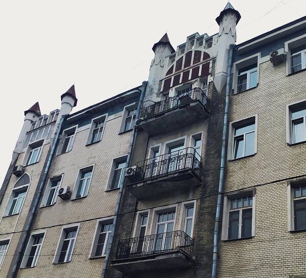 Дом напоминает сказочный замок: башня-эркер, сложные формы балконов, оригинальные трубы — всё это делает здание визуально уникальным. Пример выбран за силу метафоры в архитектуре, за архитектурное воплощение образа сказочного замка в городской среде