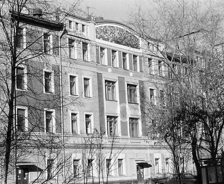 Здесь дом демонстрирует строгую геометрию фасада: плоскости гладкие, эркеры подчёркнуто прямолинейны. Контрасты создаются за счёт вставок из майолики или декоративной плитки. Подобный баланс рациональности и акцентов был важным элементом московского модерна.