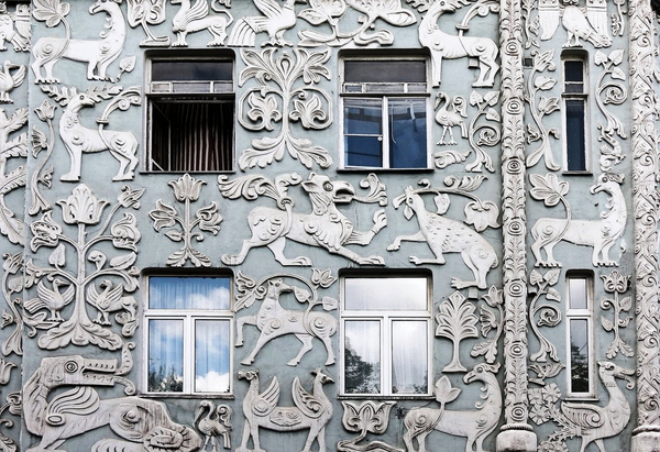 Барельефы с изображением животных и птиц создают мистическое и сказочное впечатление. Эти декоративные элементы используются не как орнамент, а как носители образов и смыслов.