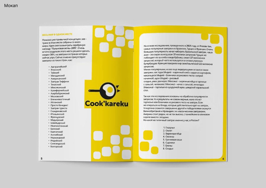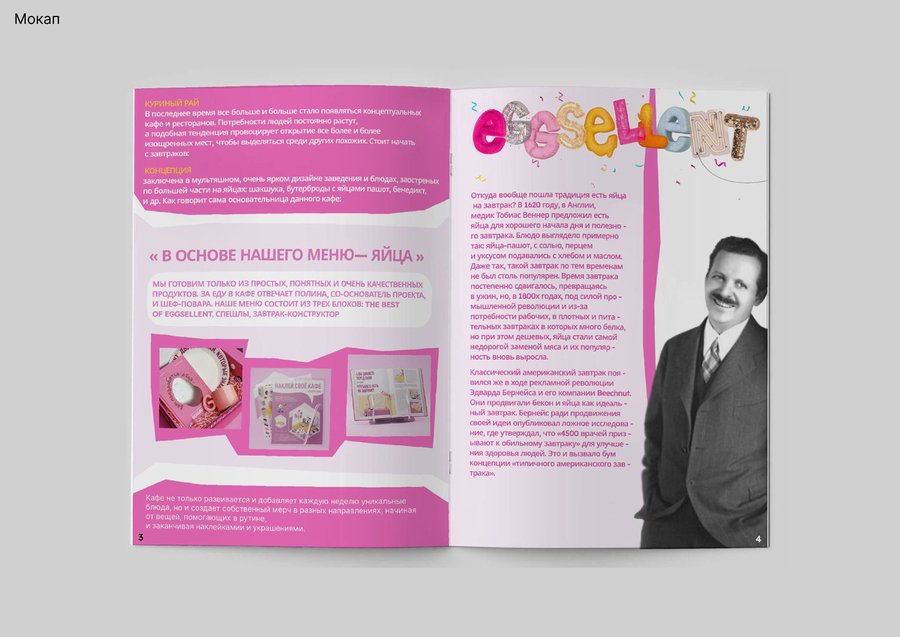 Зин поделен на несколько частей. Места для утра, вечера и для того чтобы провести время с друзьями и близкими. На приведенных ниже 2ух разворотах представлены кафе с завтраками целый день. Айдентика, представленная на страницах полностью сделана вручную, опираясь на детали, представленные на сайте и антураж внутри заведения