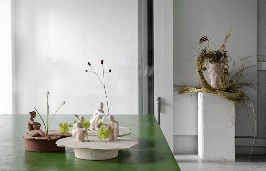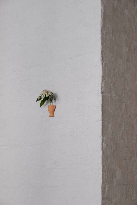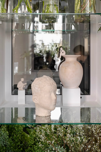 Где-то можно найти параллели между объектами и зданием: триптих некрупной керамики экспонирован под тремя точками шурупов. А на некоторые полки холодильника для растений поставили фигурки — пространство бюро активно общается с искусством.