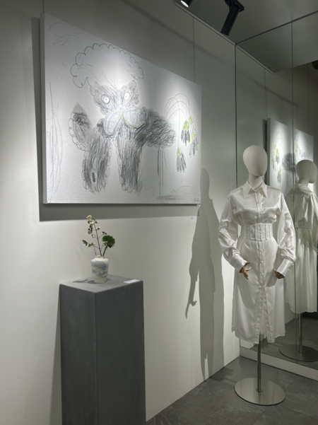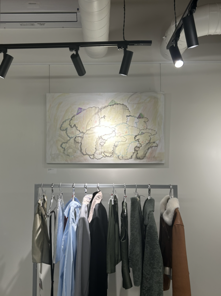Противоположный эффект достигается в пространстве «Make me happy», тот же белый фон выглядит менее удачно. Представим, что в белой комнате вывесили тафтинг ковер Тары Тарабцевой — фон подчеркивает его. Как только добавляются несколько рейлов, столик рядом, комнатный декор, работа моментально теряется в визуальном потоке. Здесь, искусство оказывается вторичным и становится фоном для одежды, которая то и дело перебивает взгляд