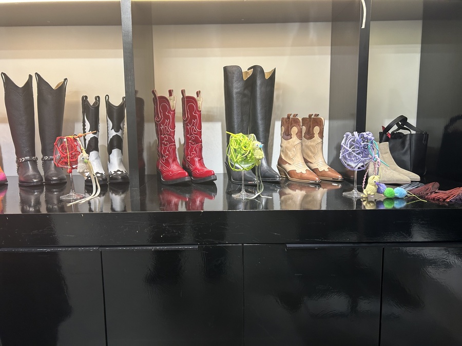К каждой новой выставке пространство Make me happy меняет развеску вещей брендов, чтобы она резонировала с временной экспозицией. С искусством пересекается не только цветовая палитра вещей, но и материалы и стилистика, в которых они смоделированы — при общем уклоне концепт-стора на привычные женственные формы и оттенки