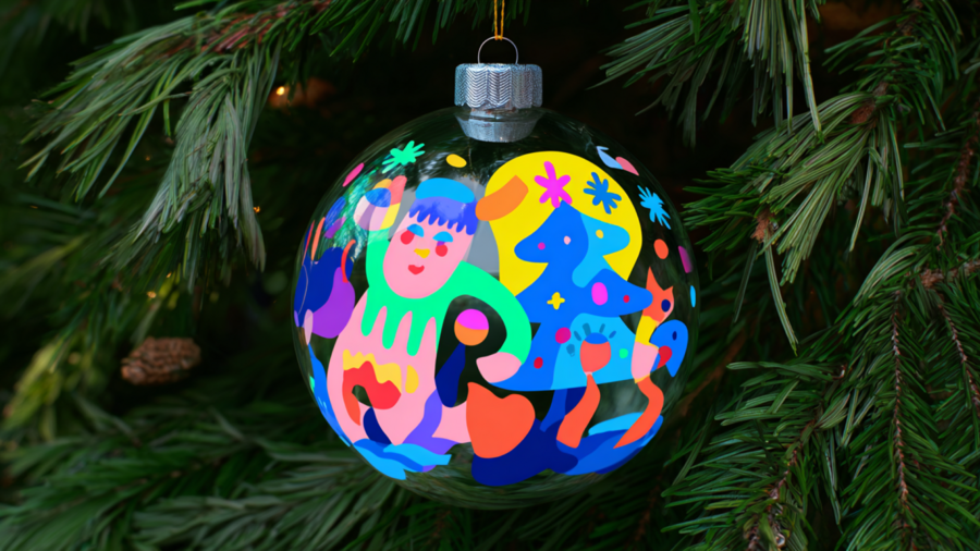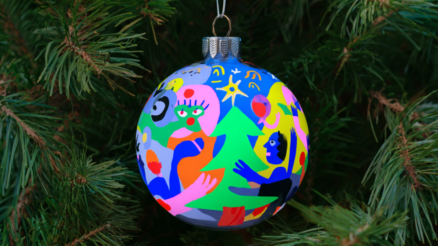 Промт для Midjourney: A Christmas tree ornament featuring multicolored abstract figures and people hanging from it. The background is green pine branches, and the glass ball has an open top, revealing its interior. It is painted in bright colors such as blue, yellow, pink, orange, and red. Stars are painted on some parts of the ornament.