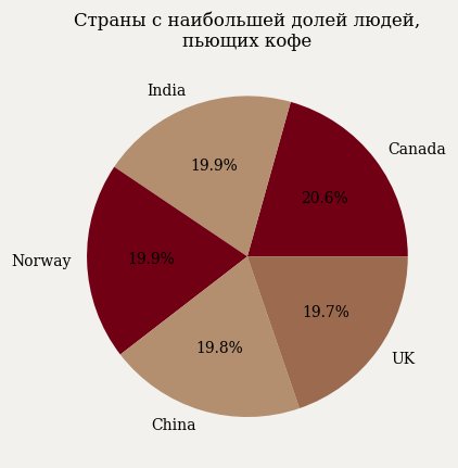 Чтобы проанализировать вопрос более подробно я создала круговую диаграмму, выявляющую пятерку стран-лидеров по потреблению кофе их гражданами. После определения страны-лидера с помощью линейного графика узнала, как количество кофе связано с уровнем стресса внутри этой группы.
