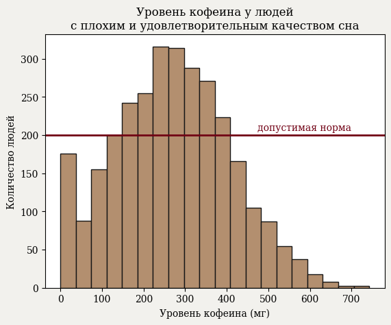 Затем я проанализировала количество потребляемого в день кофеина у людей, которые спят плохо или удовлетворительно. Гистограмма показывает распределение.
