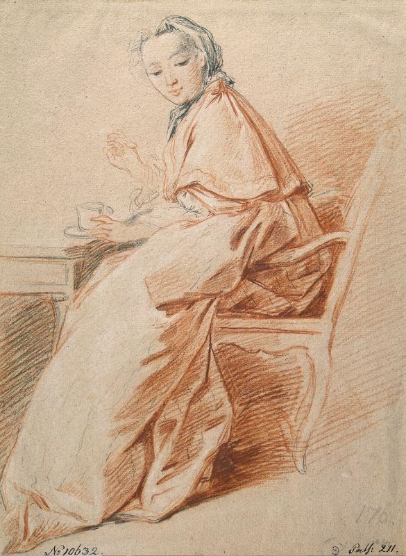 Этот эскиз демонстрирует тщательную подготовительную работу Буше над будущей картиной «Завтрак». Художник детально прорабатывает не только позу модели, но и сложную драпировку платья, уделяя особое внимание организации складок ткани — их ритму и направлению, что создает динамику даже в статичной сцене. Мягкая светотеневая моделировка позволяет передать объем фигуры и фактуру материала, в то время как легкие штрихи в области лица лишь намечают выражение, оставляя свободу для дальнейшей детализации в живописном произведении. Этот подход показывает, как Буше сочетал академическую точность в передаче форм со спонтанностью исполнения, создавая основу для законченной композиции, где каждый элемент уже продуман на этапе рисунка.