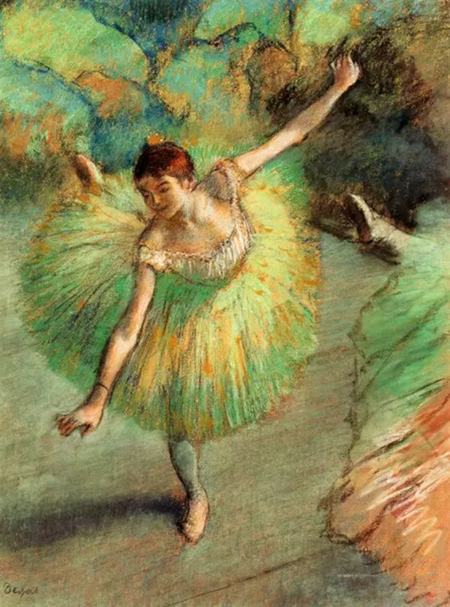 В картине «Балет в Парижской опере» также выбран нестандартный ракурс — вид из-за оркестровой ямы, но все равно как бы сверху. Диагональ танца балерин поддерживают очертания зелени с декораций, наклоненные в том же направлении.