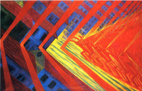 Так, можем увидеть, что художники для визуализации скорости использовали такие приемы, как создание вибрации (пульсации) посредством многократного наложения, резкие геометрические фигуры для создания направления, диагональные линии для динамики, а также механический порядок для характеристики индустриальной эпохи и работы техники.