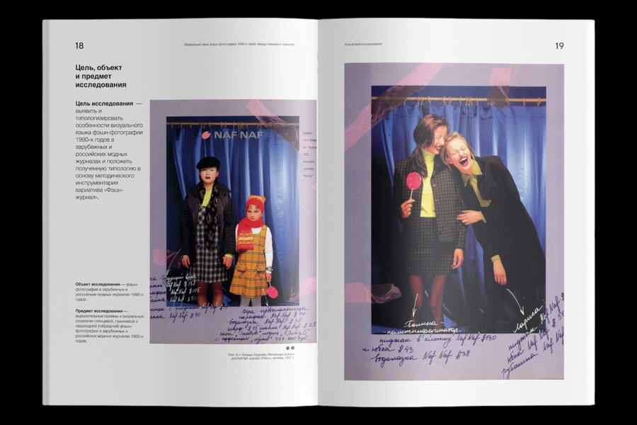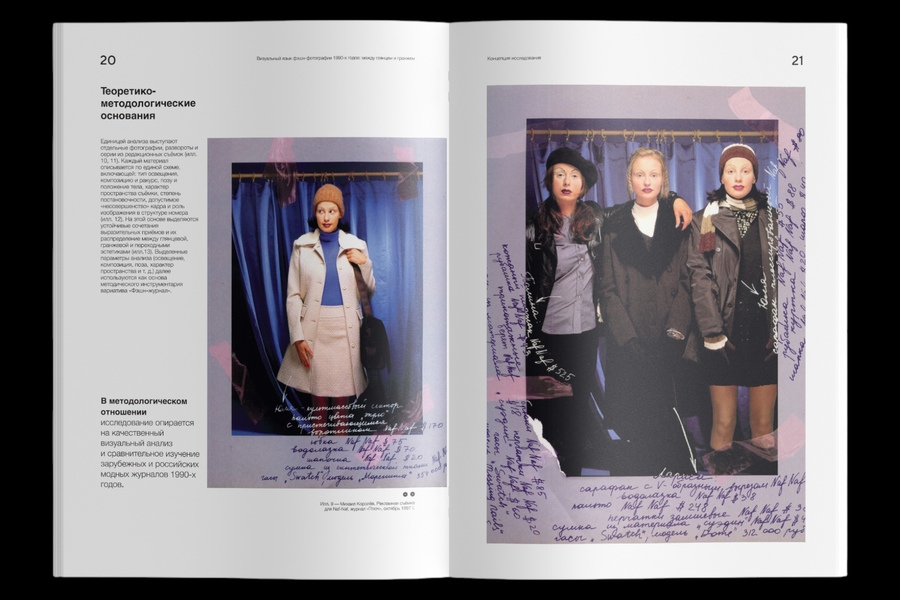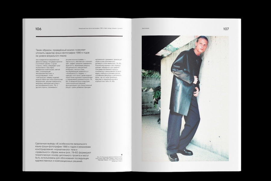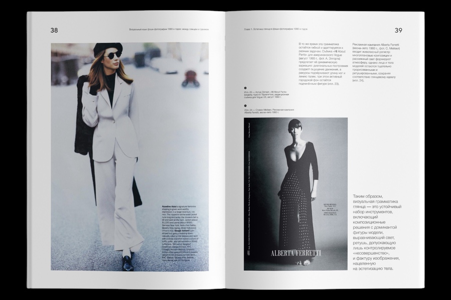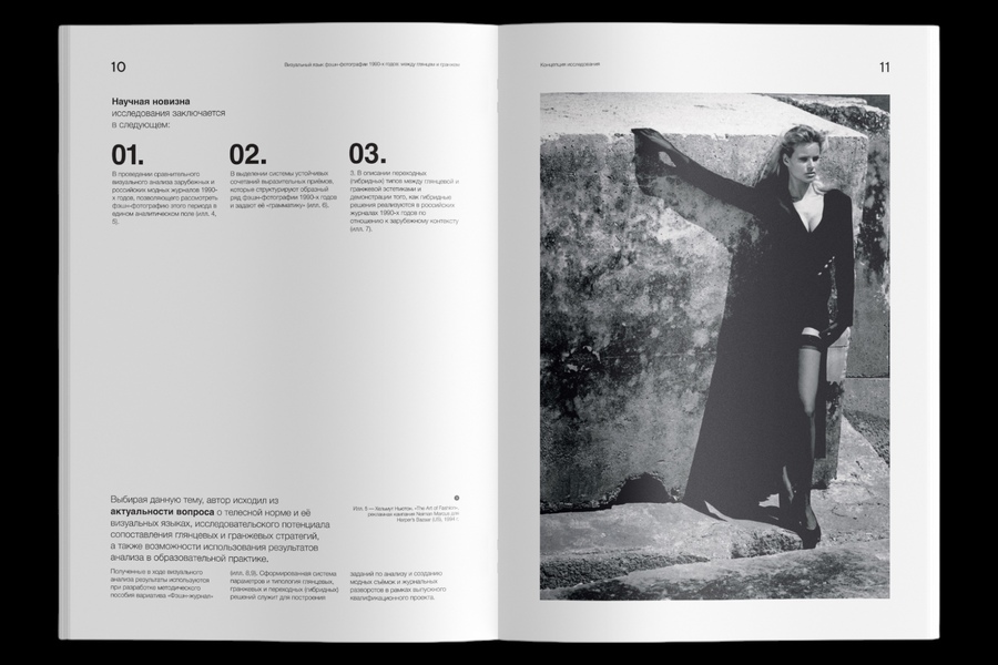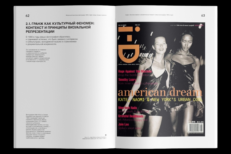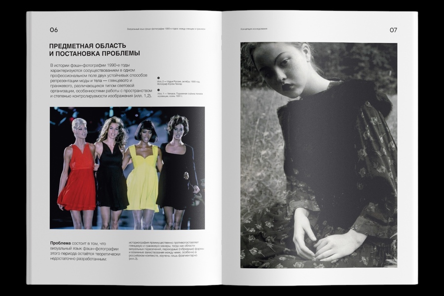 Исследование описывает визуальный язык фэшн-фотографии 1990-х в зарубежных и российских модных журналах через сопоставление глянцевой и гранжевой манер и выделение гибридных решений. Метод — сравнительный визуальный анализ фотографий и разворотов по параметрам освещения, композиции/ракурса и характера пространства. Результат — типология глянцевых, гранжевых и гибридных стратегий, использованная как основание методического инструментария вариатива «Фэшн-журнал» (задания по анализу и проектированию съёмок и разворотов).