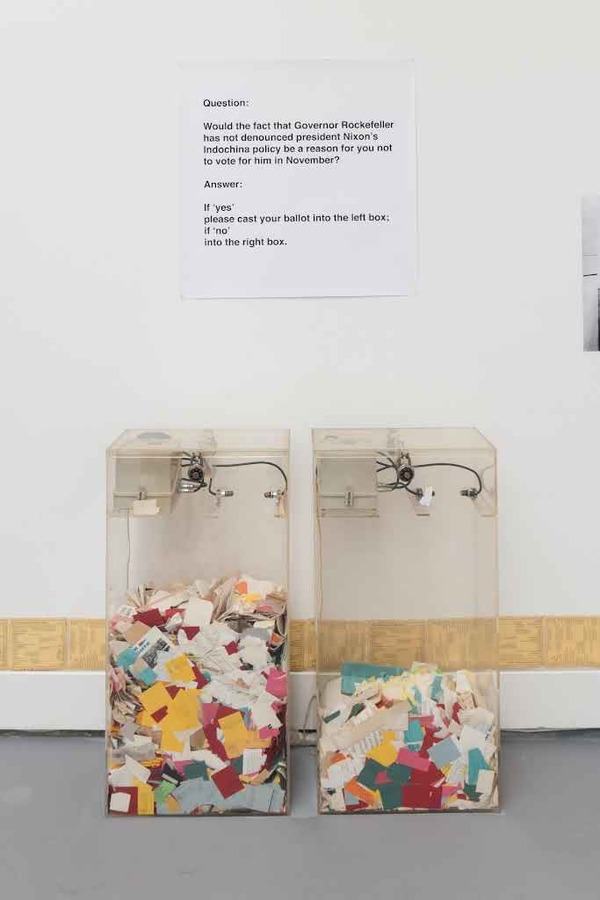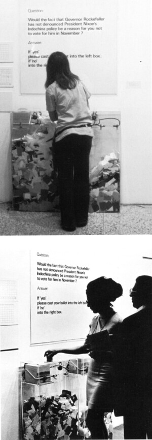 На выставке «Информация» (1970) в нью-йоркском МоМА, где членом попечительского совета был Нельсон Рокфеллер, губернатор Нью-Йорка, Хааке представил свою работы под названием «MoMA Poll». Это была инсталляция, состоящая из двух прозрачных урн для голосования. На одной было написано «Да», на другой — «Нет». Рядом был вопрос: «Стал бы для вас факт, что губернатор Рокфеллер не осуждает политику президента Никсона в Индокитае, достаточным, чтобы не голосовать за него в ноябре? Если да, бросьте свой бюллетень в левую урну. Если нет — в правую». В итоге в левой урне оказалось в два раза больше бюллетеней.