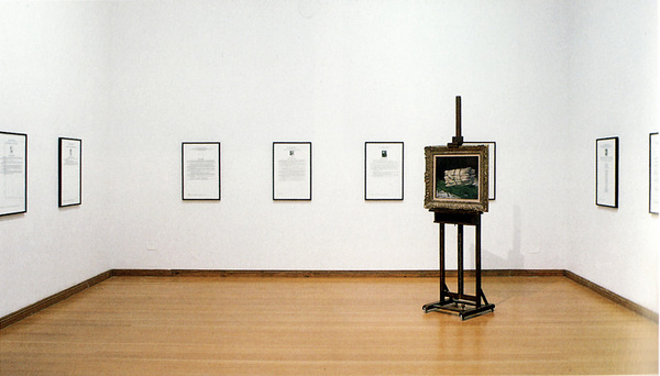 «Разного рода опорные элементы работы (каркас, место, подставка, рама, оборотная сторона, цена и т. д.) остаются для нас невидимыми или необозначенными/скрытыми — это факт вовсе не „естественный“ и случайный, как нас хотели бы заставить думать, а тщательно замаскированная буржуазная идеология, на службе у которой — сами художники. Это камуфляж, „посредством которого буржуазия превращает реальный мир в образ мира, Историю в Природу“».