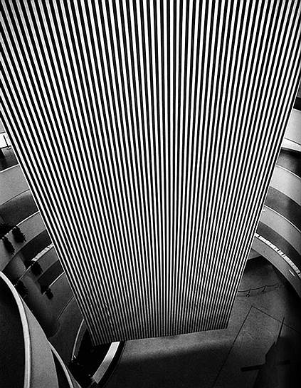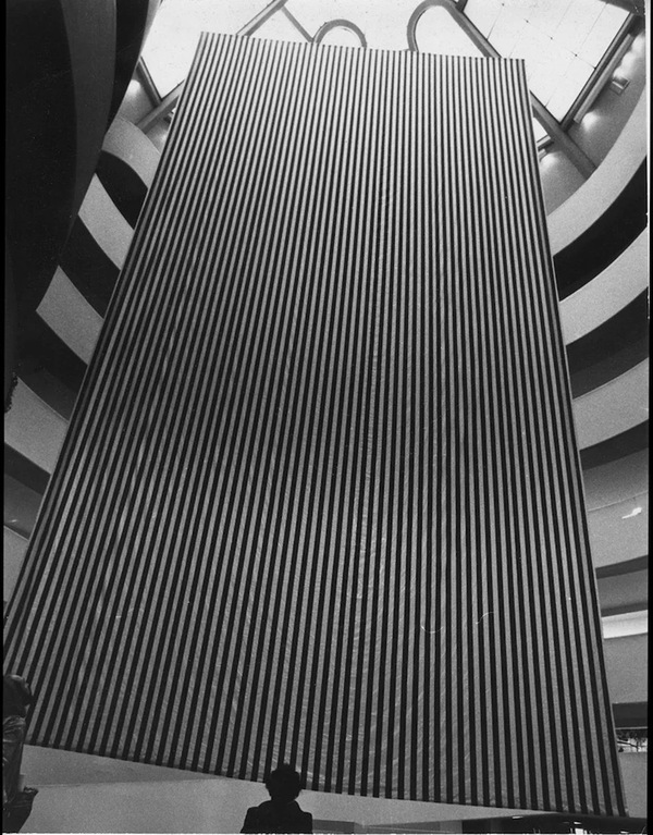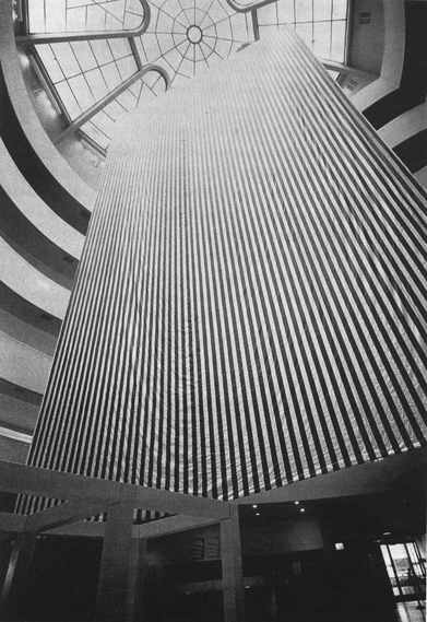 Но самым громким высказыванием Бюрена стало его участие в групповой вытаставке на площадке музея Гуггенхайма. Даниэль Бюрен разместил свою работу — масштабное полосатое полотно, подвешенное к потолку цилиндрического атриума. Эта инсталляция буквально музей пополам.