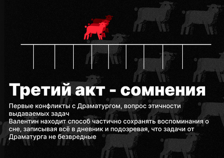 Вскоре каждому из них придётся сделать морально сложный выбор: отказаться от новой реальности, где наконец есть сон, или продолжить выполнять ужасные задания, которые даёт Драматург.