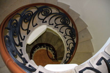 Парадная лестница в особняке С. П. Рябушинского. Шехтель создает тотальный художественный образ: мрамор имитирует водную гладь, кованые перила — спиралевидные ростки, а светильник — медузу