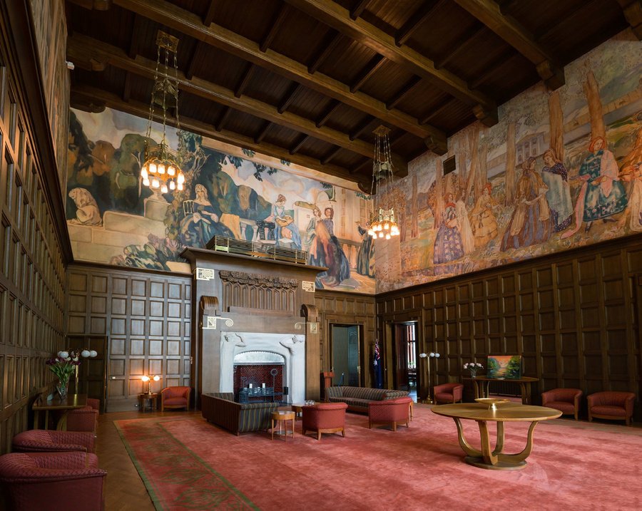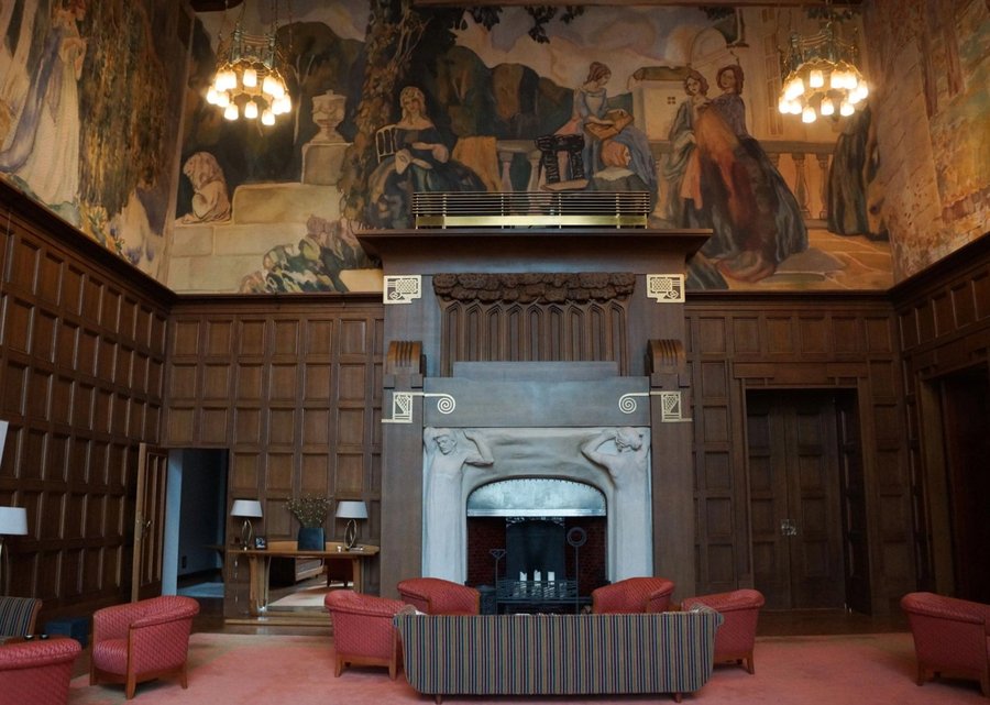 Реставрированный интерьер, украшенный панно, воссозданными на ткани по рисункам Борисова-Мусатова