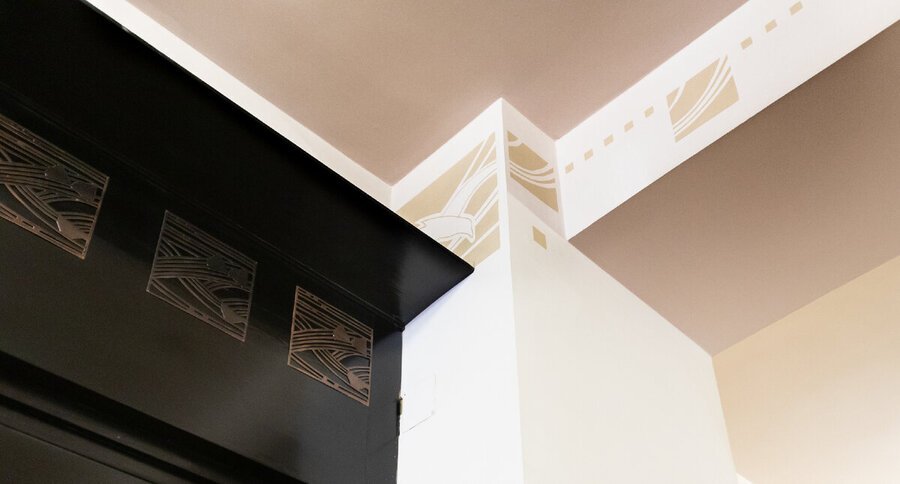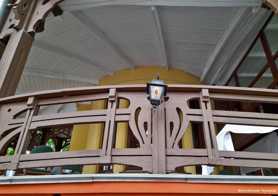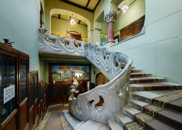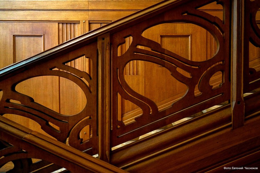Плавный изгиб балкона визуально перекликается с волнообразными мотивами декоративной росписи на стенах, образуя сложный пространственный ритм. Этот архитектурно-художественный прием демонстрирует характерный для модерна принцип синтеза искусств, где конструктивные элементы и декор существуют в неразрывном диалоге.