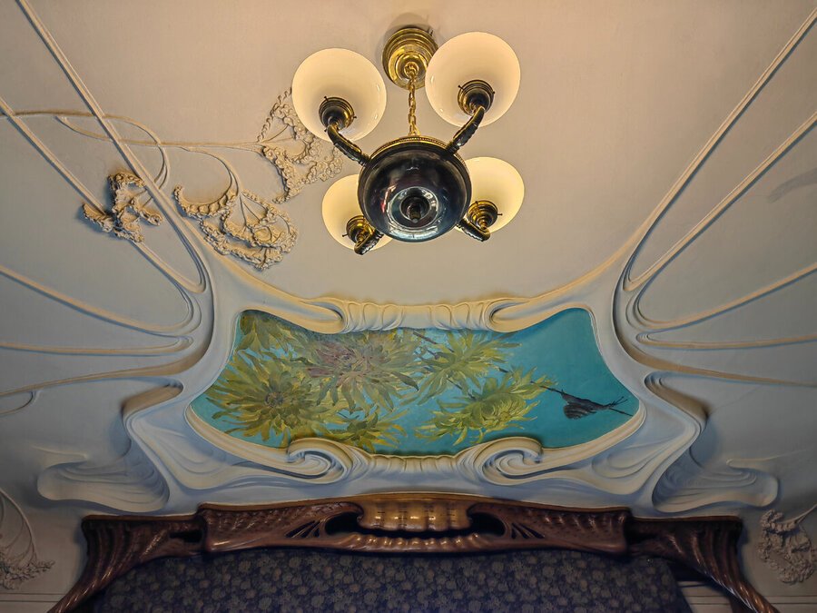 Парадная мужская гостиная в особняке Рябушинского. Лепной декор с цветами незабудки на потолке