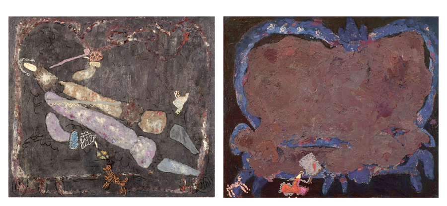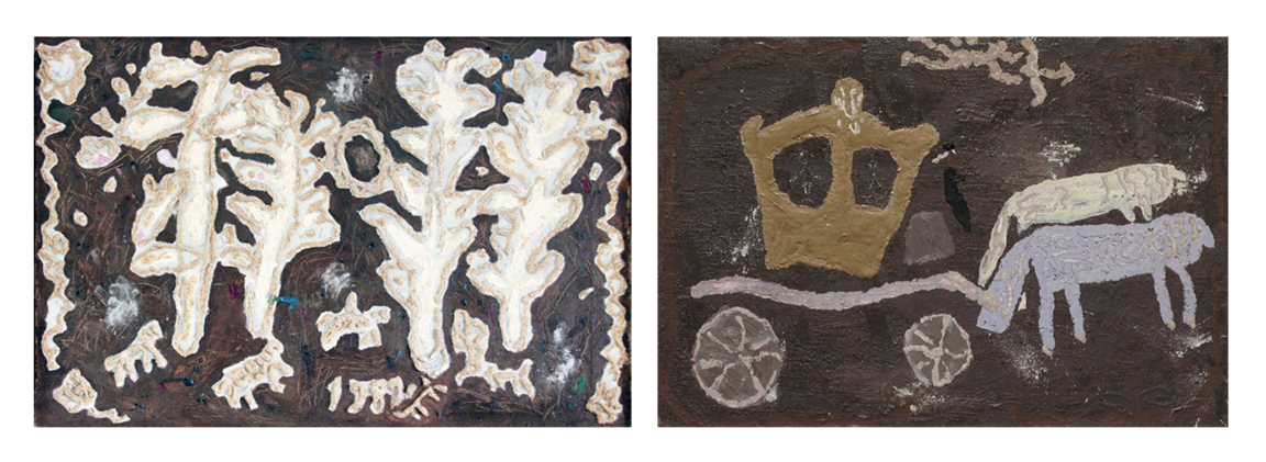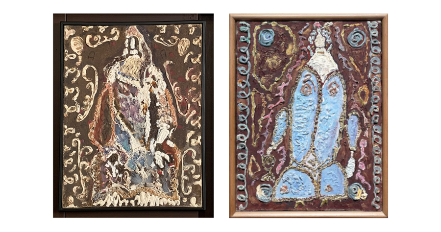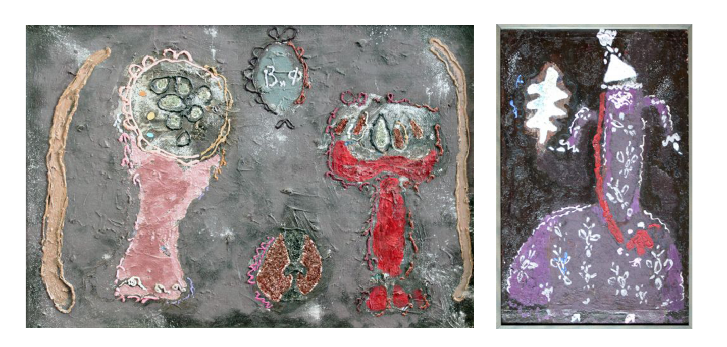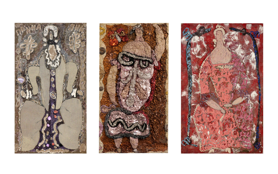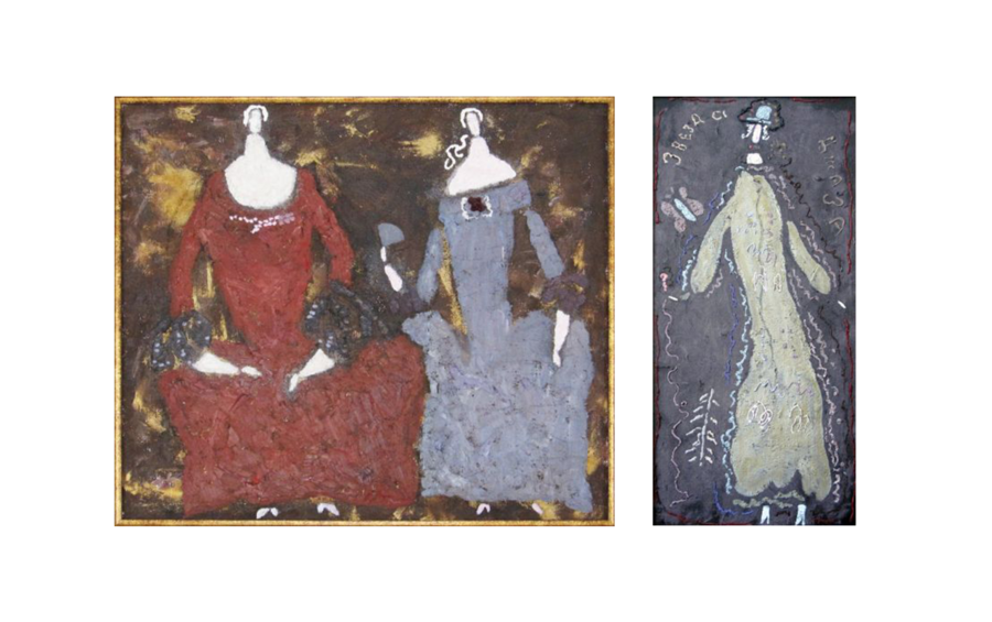 Дамы, 1970-е, холст, фольга, смешанная техника, 41×22,5 см (каждая) Вазы и фрукты, 1975 г. холст, масло, 40×58 см. Дама с ёлкой, 1981 г. холст, масло, 55×35 см.