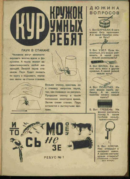 Журнал «Чиж» 1930 год, № 1, стр16-17. ШКОЛА «ЧИЖА». М. Ильина, рис. М. Разулевича. ЗАГАДКИ. В. Ильиной, рис. М. Штерн.