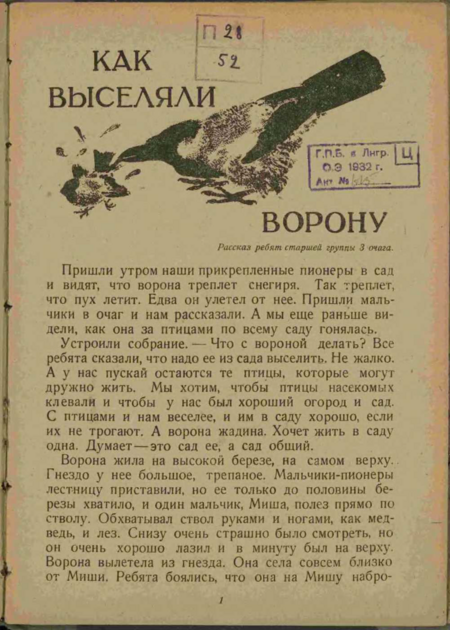 1. Журнал «Чиж» 1932 год, № 4-5. Обложка рис. Е. Чарушина 2. Журнал «Чиж» 1932 год, № 7-8. КАК ВЫСЕЛЯЛИ ВОРОНУ, рассказ ребят 3 очага, рис. Е. Чарушина