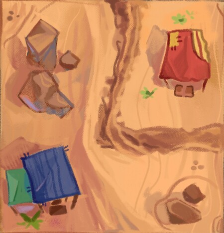 На основе референсов я анализировала палитру, выбирала оттенки, которые поддерживают атмосферу песчаной среды, и параллельно следила за читабельностью — чтобы элементы не сливались и хорошо воспринимались на столе.